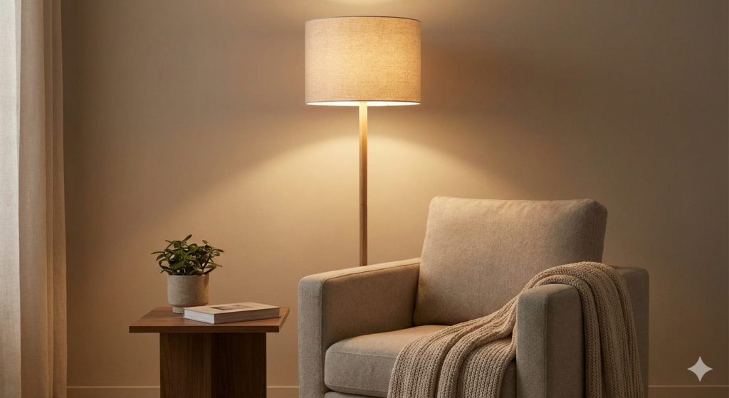 A luz crua do teto é inimiga do relaxamento. A forma mais simples e barata de criar ambientes aconchegantes é dominar a iluminação. Dessa maneira, troque a luz central por abajures, luminárias de piso ou fitas de LED com luz quente (amarelada). Assim, isso sinaliza ao seu cérebro que é hora de relaxar, criando um clima mais acolhedor enquanto gasta pouco.