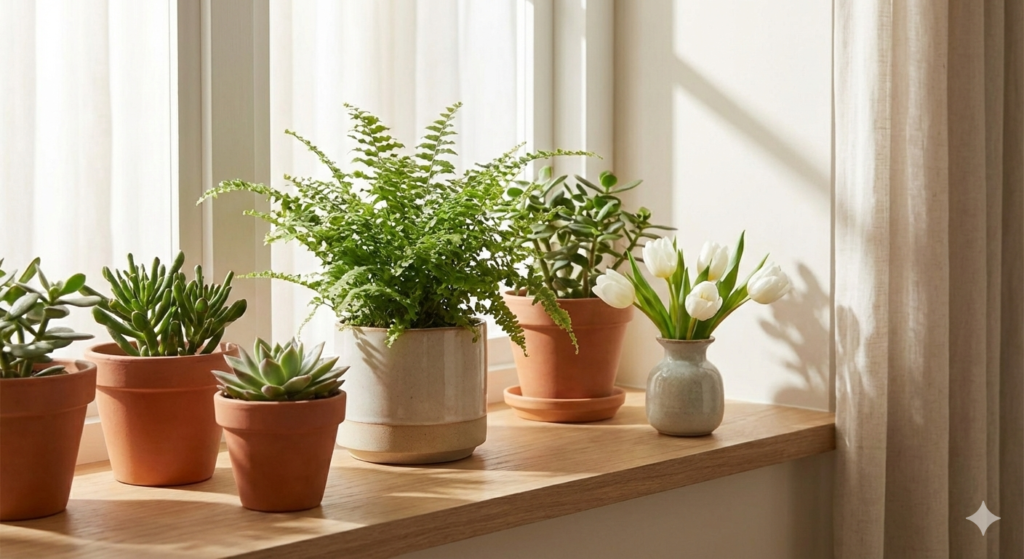 Sugestão: comece com vasinhos de suculentas, jiboia, espada-de-são-jorge ou zamioculca – são resistentes e baratas. Um pouco de verde faz uma diferença enorme na sensação de lar.