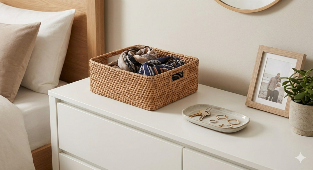 Ambientes desorganizados causam estresse, mesmo que de forma inconsciente. Organizar o que você já tem é uma das formas mais baratas de melhorar o conforto mental e fisíco em casa. Investir em soluções de armazenamento simples, como cestos e bandejas, ajuda a manter a ordem e a criar uma sensação de paz e tranquilidade em casa.